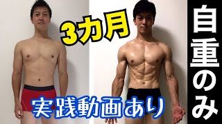 注)この動画は0から3ヶ月でこのカラダ!という動画ではありません。左の写真から右の写真まで3ヶ月、そしてその3ヶ月間は自重トレーニングという動画です。絞る前4年間はジムに行っていませんが20代前半の頃にジムに行っていた経験はあります。